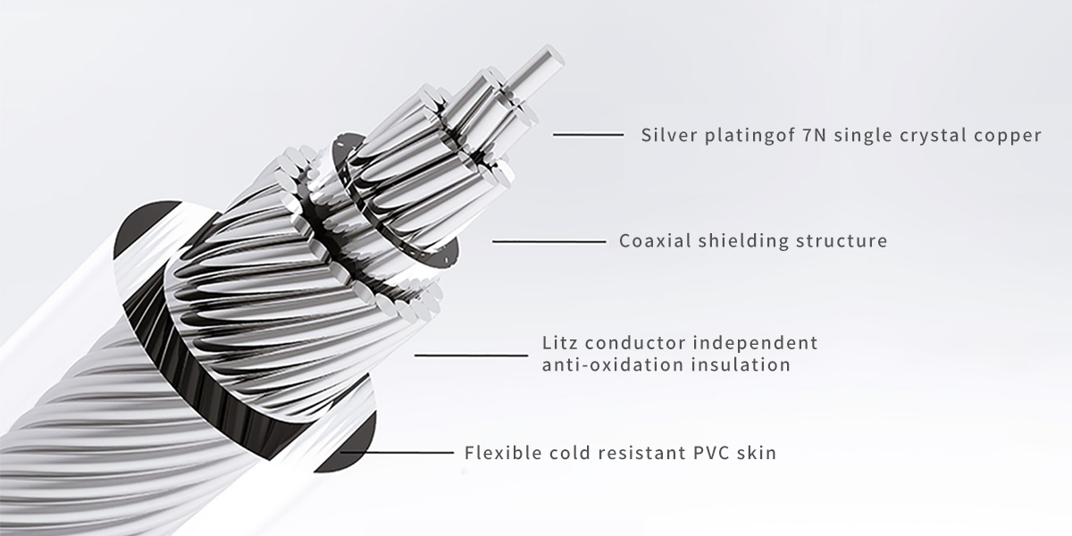 鍍金的輸出入接口,導體採用7N單晶銅導線,不同於傳統多結晶銅線,在信號跨結晶傳導時會產生折射及反射,而單晶銅的傳導損失極少,阻抗更低,失真更小。表面鍍銀能夠提供更好的信號傳導能力、高頻延伸及音樂解析度。雙層隔離設計能夠更進一步降低雜訊的干擾,讓背景更黑,聲音更純淨。